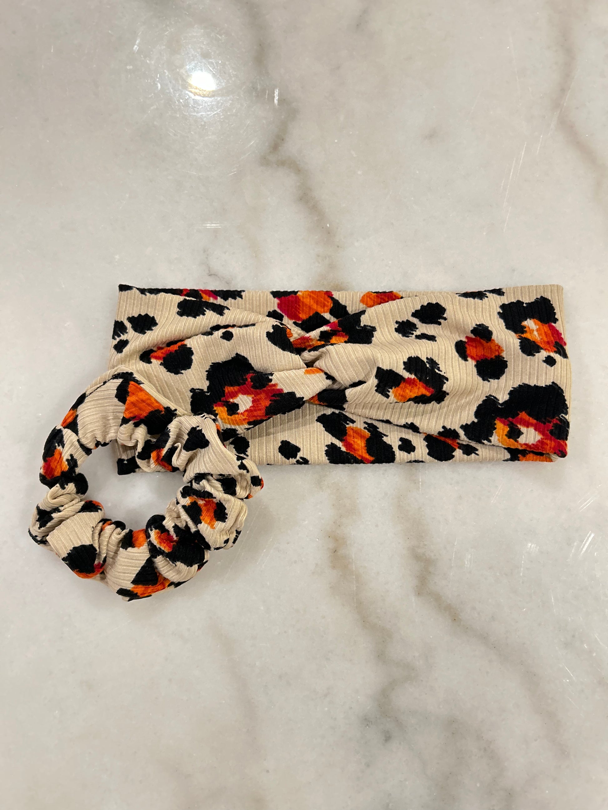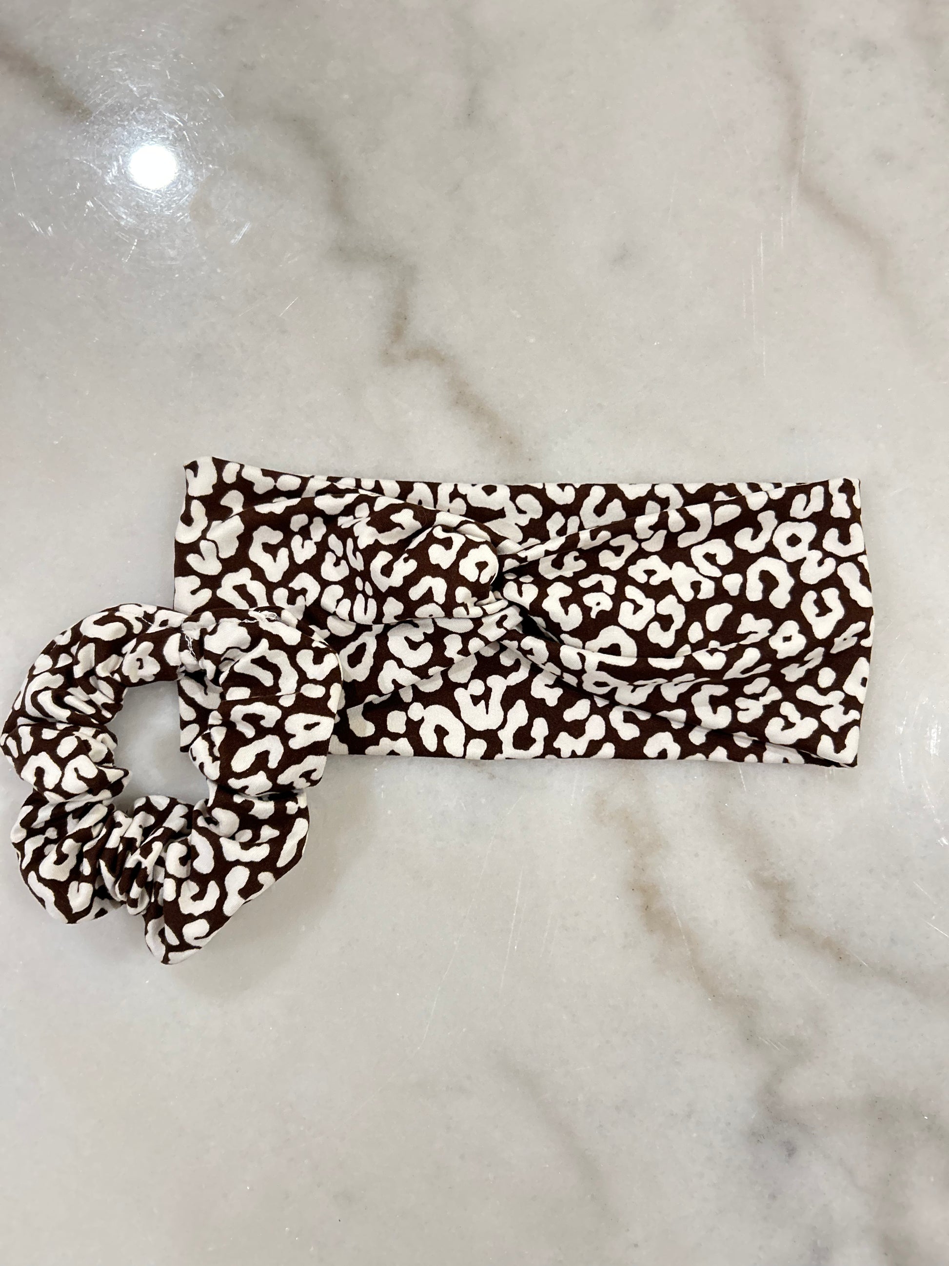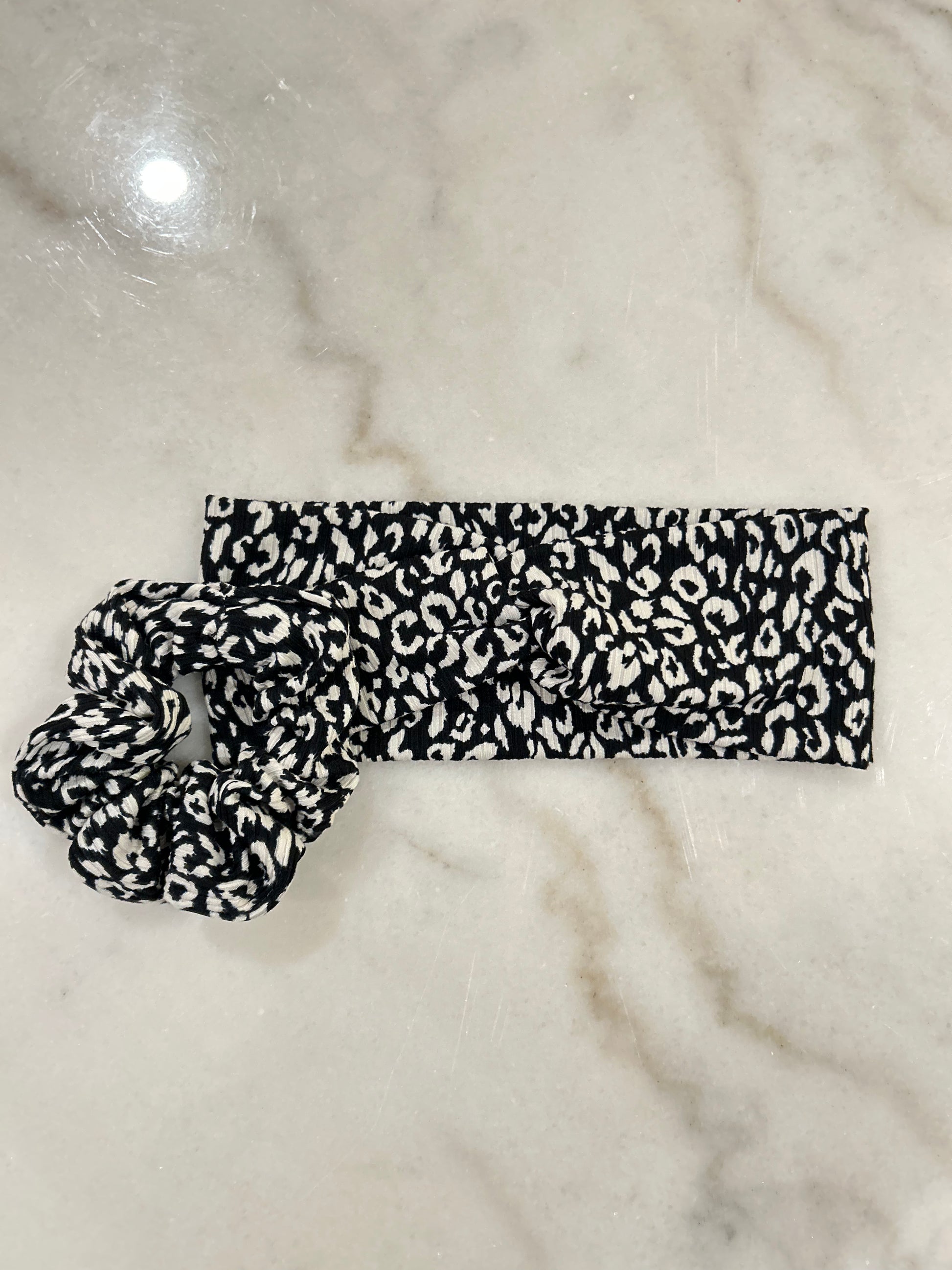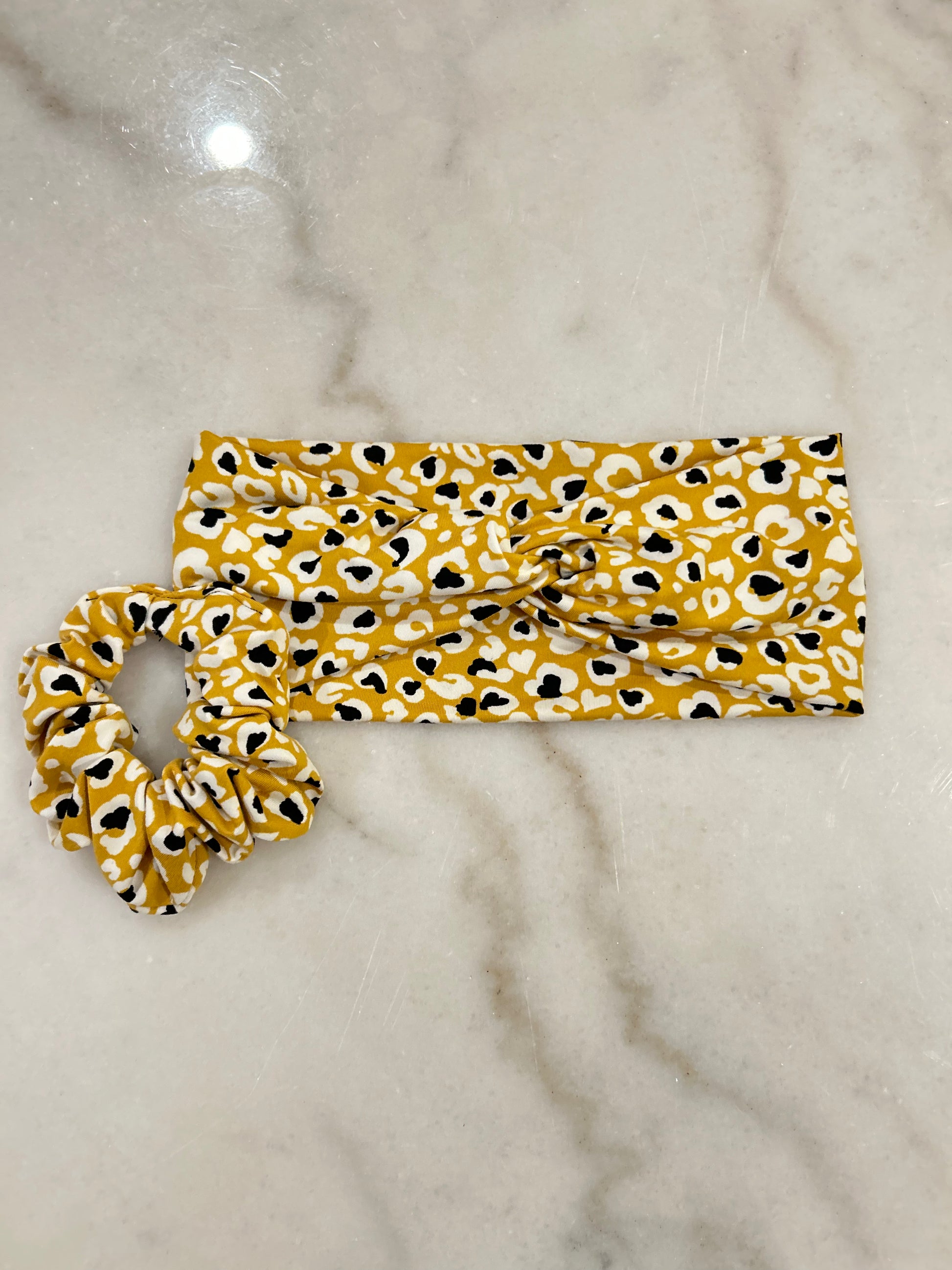 • Matching scrunchie + knotted headband — made from the same soft, stretchy fabric